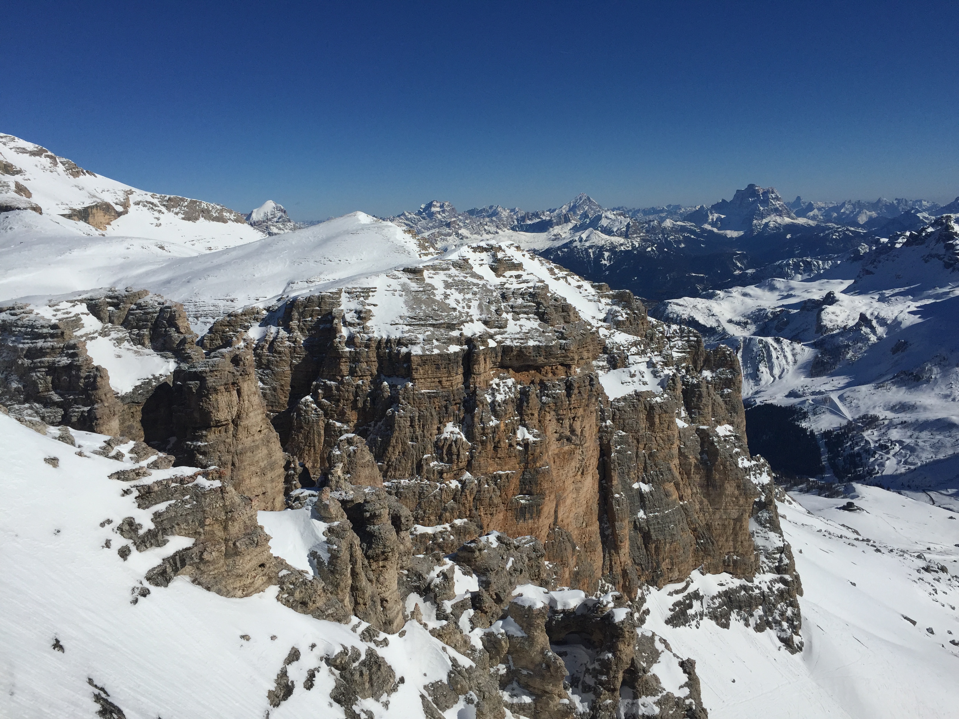 돌로미티는 암반이 바다에서 한꺼번에 떼를 지어 솟아오른 특수지형이다. 암석에 마그네슘, 칼슘, 철 등이 함유되어 있어 특히 일출 및 일몰 시 암석이 붉은색을 띄게 되는데, 이 모습이 돌로미티의 매력이기도 하다. 침식활동이 심하므로 변화도 다양다채(多洋多彩)하다. 최고봉은 마르몰라다(Marmolada)로 3,343m이다. 정상을 올라서면 직선의 첨봉(尖峰)이 주는 위압감은 거역할 수 없이 순응하는 유럽 민족의 원형(原形)을 만들었다는 생각이 든다. 케이블카 뒤로 보이는 붉은 바위산 암벽이 영화 "클리프 헹어"의 주요 촬영지라고 한다.